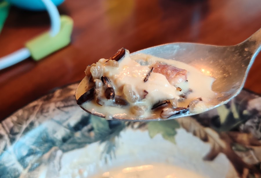 - Simmer wild rice, garlic, onion, broth, pepper and 2 slices of uncooked bacon for 60 min (some wild rices take more like 75 min) covered.